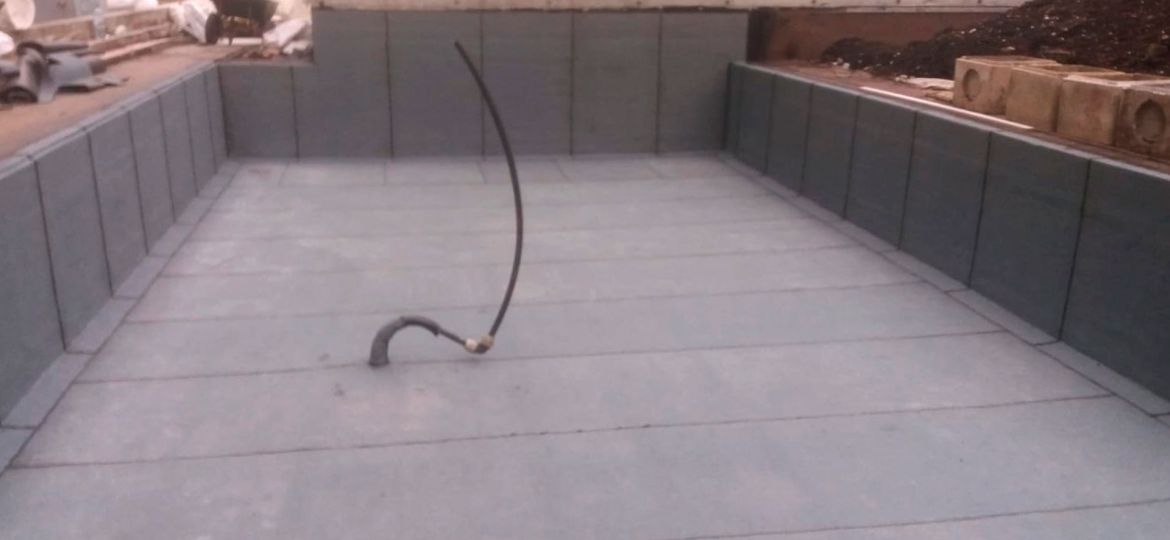 Une chape élastomère par paillettes d’ardoise 180g/m2 anti-Racine, type GRAVIFLEX soudée en plein, en dépassant au-dessus de la première couche d’une hauteur de 5 cm.